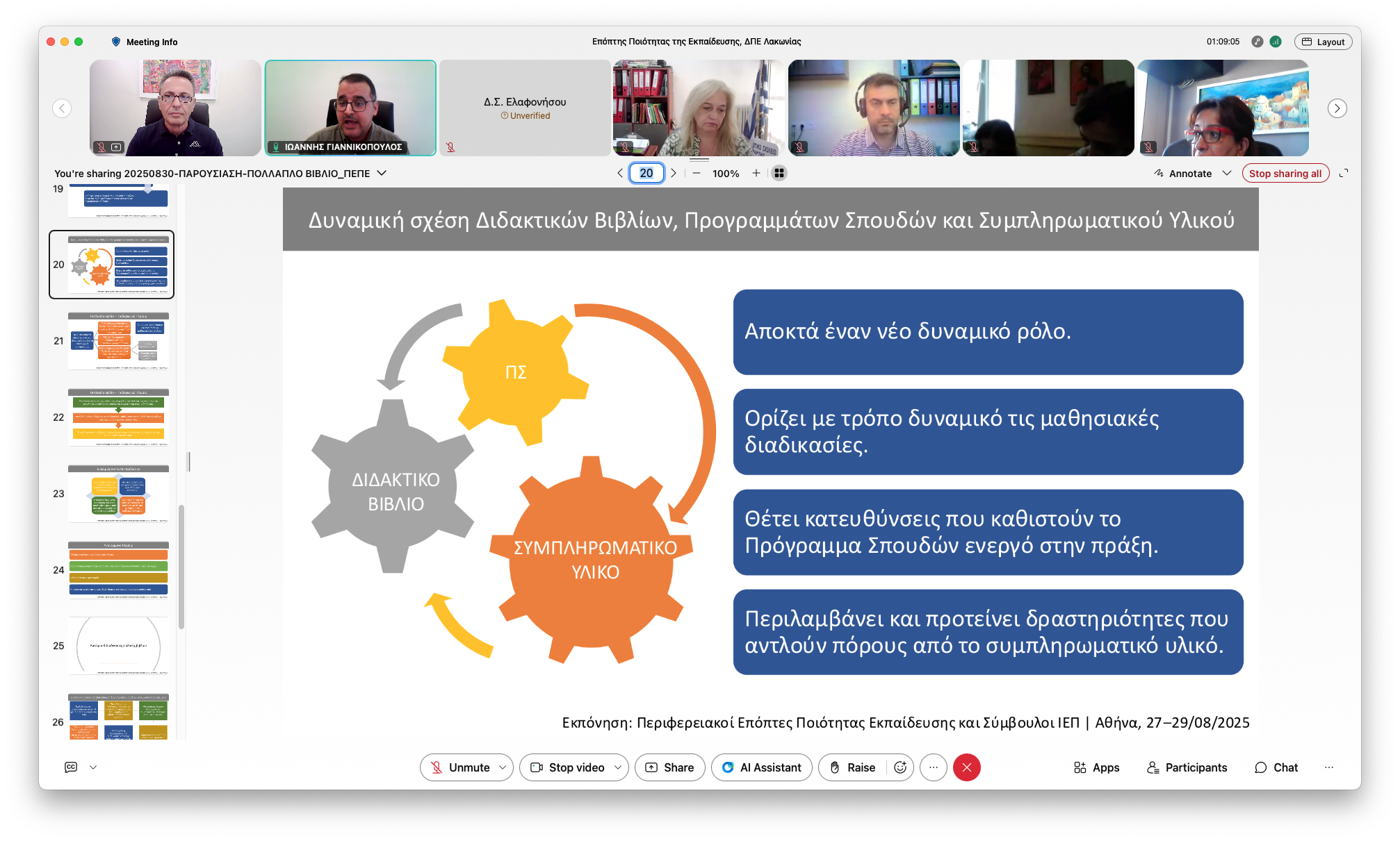 Την Πέμπτη 25 Σεπτεμβρίου 2025 (10:00 έως 11:30) πραγματοποιήθηκε -μέσω του περιβάλλοντος Webex- συνάντηση εργασίας με πρωτοβουλία του Επόπτη Ποιότητας της Εκπαίδευσης της Διεύθυνσης Π.Ε. Λακωνίας, Δρ. Αντώνιου Κοκκονού, και σε συνεργασία με τον Σύμβουλο Εκπαίδευσης Δασκάλων της 1ης Ενότητας Δημοτικών Σχολείων, κ. Ιωάννη Γιαννικόπουλο.